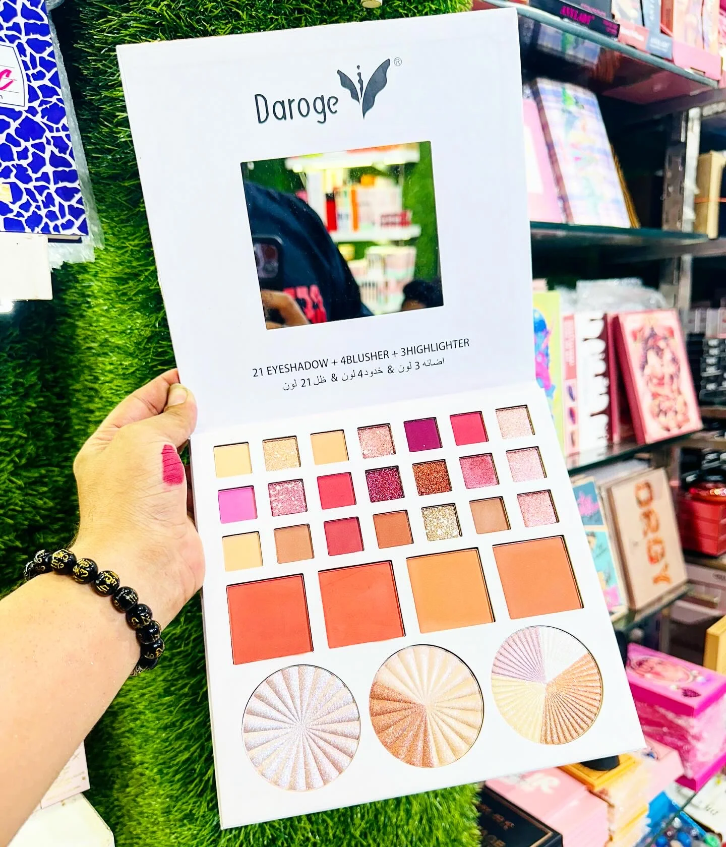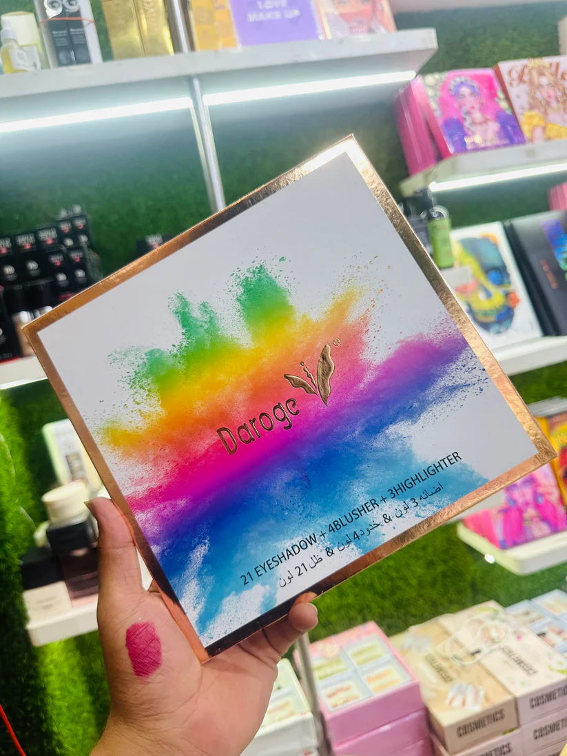 Indulge in luxury with the DAROGE DUBAI SUPRISE PALLETE. This premium palette features 3 glowing highlighters, 21 versatile eyeshadows, and 4 stunning blushers. Each shade is carefully selected for a flawless and professional makeup look. Elevate your beauty routine with this exclusive palette.